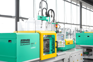 Mašine Edrive (E) sa silama zatvaranja od 350 do 5000 kN su odgovarajuće za zahtevne zadatke na području injekcionog brizganja, potrošnja energije je za 50 posto manja nego kod uporedivih hidrauličnih mašina. Na sajmu izložena brizgalica Allrounder 370 E sa silom zatvaranja 600 kN i injekcionom jedinicom veličine 170, opremljenom sa izuzetno izdržljivim cilindrom i 30-mm pužem, radila je s preciznim alatom proizvođača Stamm i izrađivala po dva 8,5-gramska kućišta za brusilice noževa u 23-sekundnom ciklu. Mašina je bila opremljena sa robotom Integralpicker V sa tri servo-ose, koje omogućavaju brzo i precizno mešanje.
