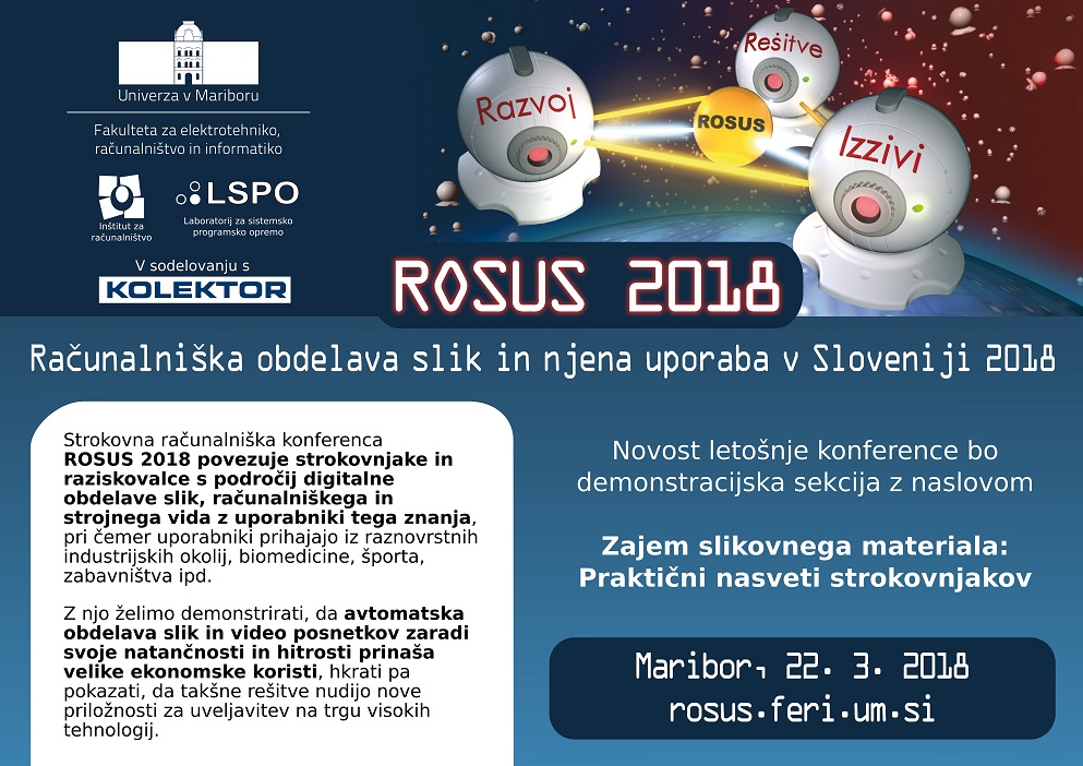 Konferenca povezuje strokovnjake in raziskovalce s področij digitalne obdelave slik, računalniškega in strojnega vida z uporabniki tega znanja, pri čemer uporabniki prihajajo iz raznovrstnih industrijskih okolij, biomedicine, športa, zabavništva in sorodnih področij. ROSUS 2018 ne želi le demonstrirati, da avtomatska obdelava digitalnih slik in video posnetkov zaradi svoje natančnosti in hitrosti prinaša velike ekonomske koristi, ampak tudi dokazati, da aplikacije računalniške obdelave slik nudijo nove priložnosti za uveljavitev na trgu visokih tehnologij.13. strokovna konferenca ROSUS 2018 bo v četrtek, 22. marca 2018 na UM-FERI (predavalnica G2–Beta). Novost letošnje konference bo demonstracijska sekcija z naslovom »Zajem slikovnega materiala: Praktični nasveti strokovnjakov«.