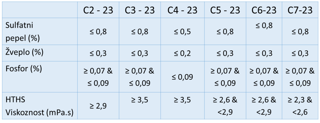 Tabela 1: Skupina specifikacija C prema ACEA 2023 – Zahtevi u pogledu SAPS